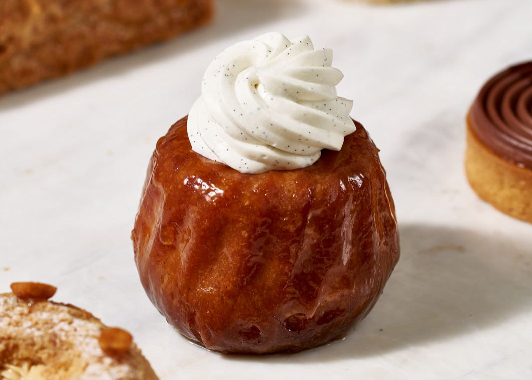 Aluat dospit îmbibat în rom, glazurat cu o dulceață de caise și decorată cu o cremă Chantilly.