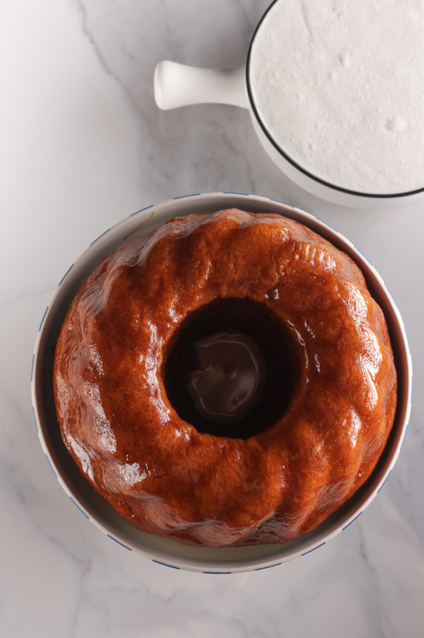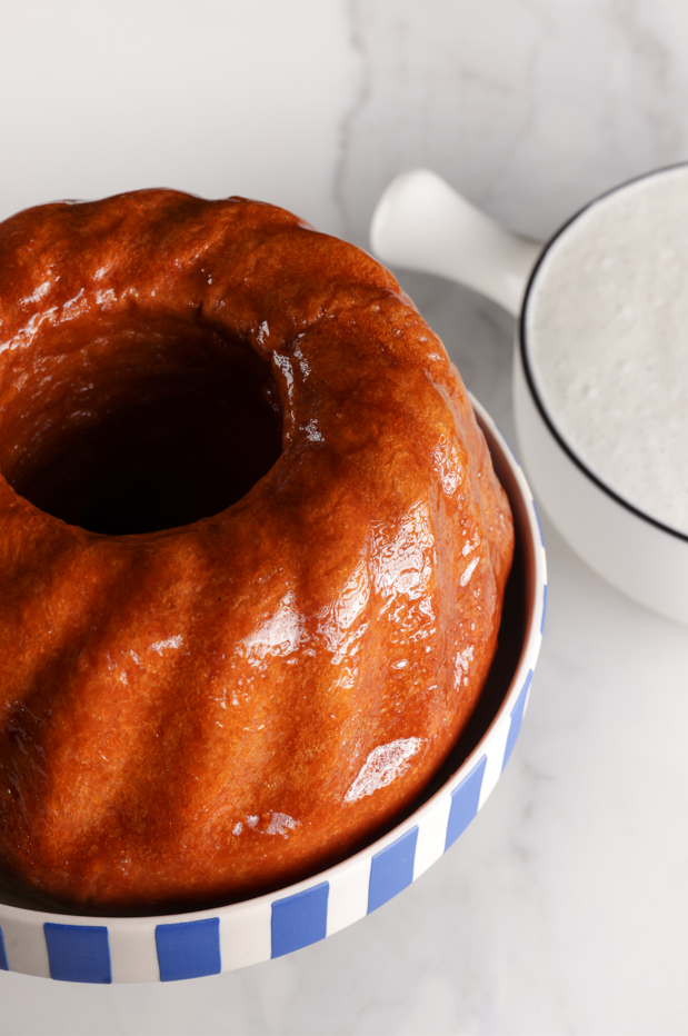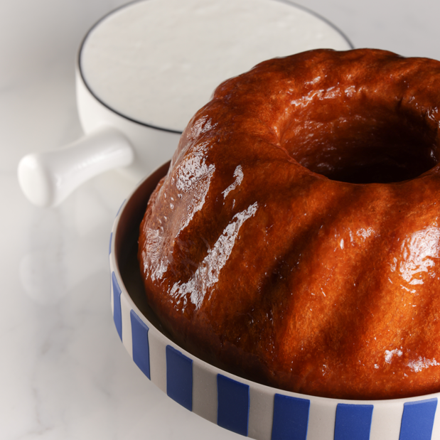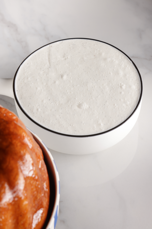 Prăjitură din aluat dospit, cu dulceață de caise, imbibată in sirop de citrice cu rom, decorată cu cremă chantilly de vanilie.