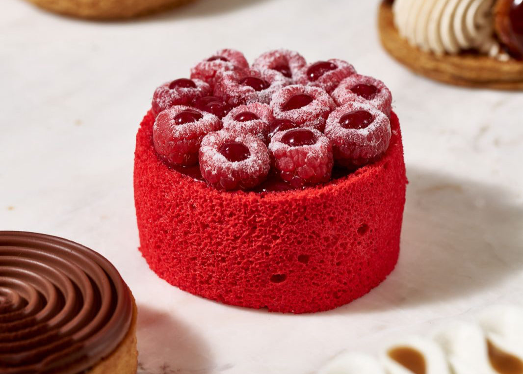 Blat crocant cu fulgi de migdale, mousse lejer de zmeură, insert de zmeură, decor din zmeură proaspată.