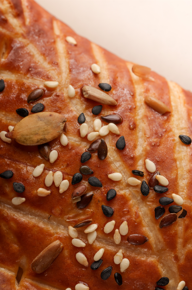 Aluat foietaj clasic, umplut cu patru tipuri de brânză și acoperit cu mix de semințe.