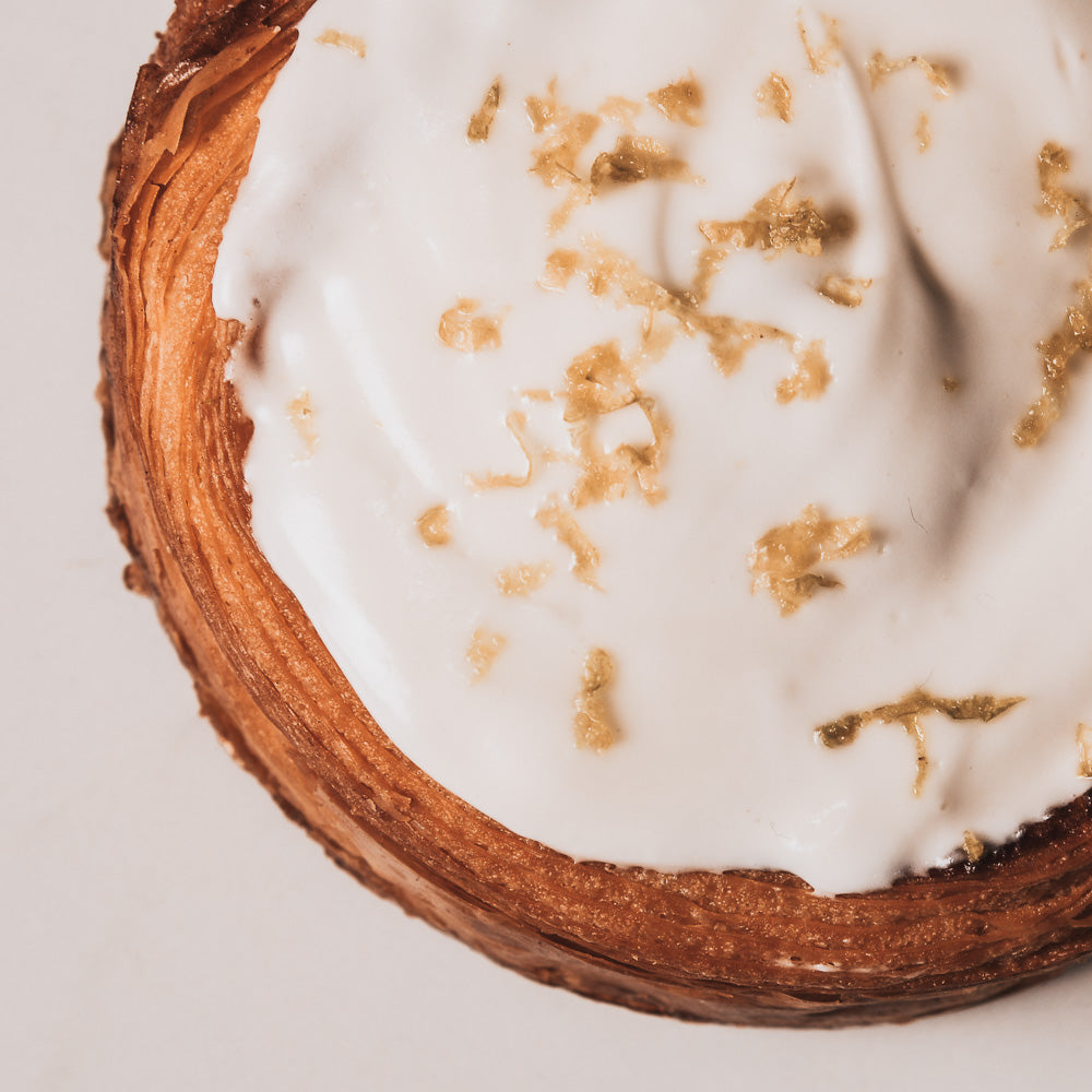 Aluat foietaj fermentat, umplut cu cremă de zahăr brun, scorțișoară și unt, glazurat cu cremă de brânză și lime.