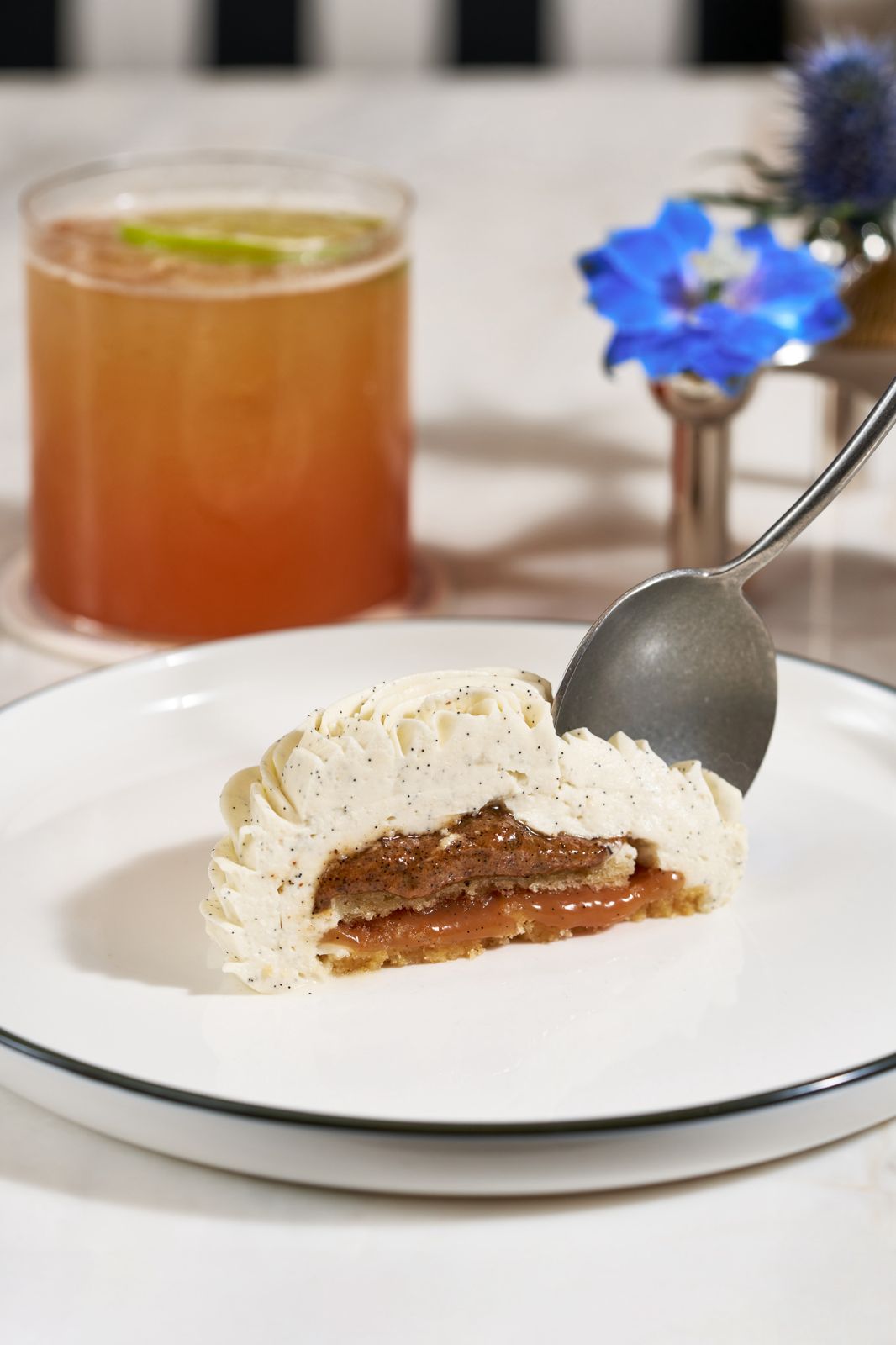 Blat sablé crocant, blat pufos cu migdale, inimă de caramel sărat și praliné de vanilie.