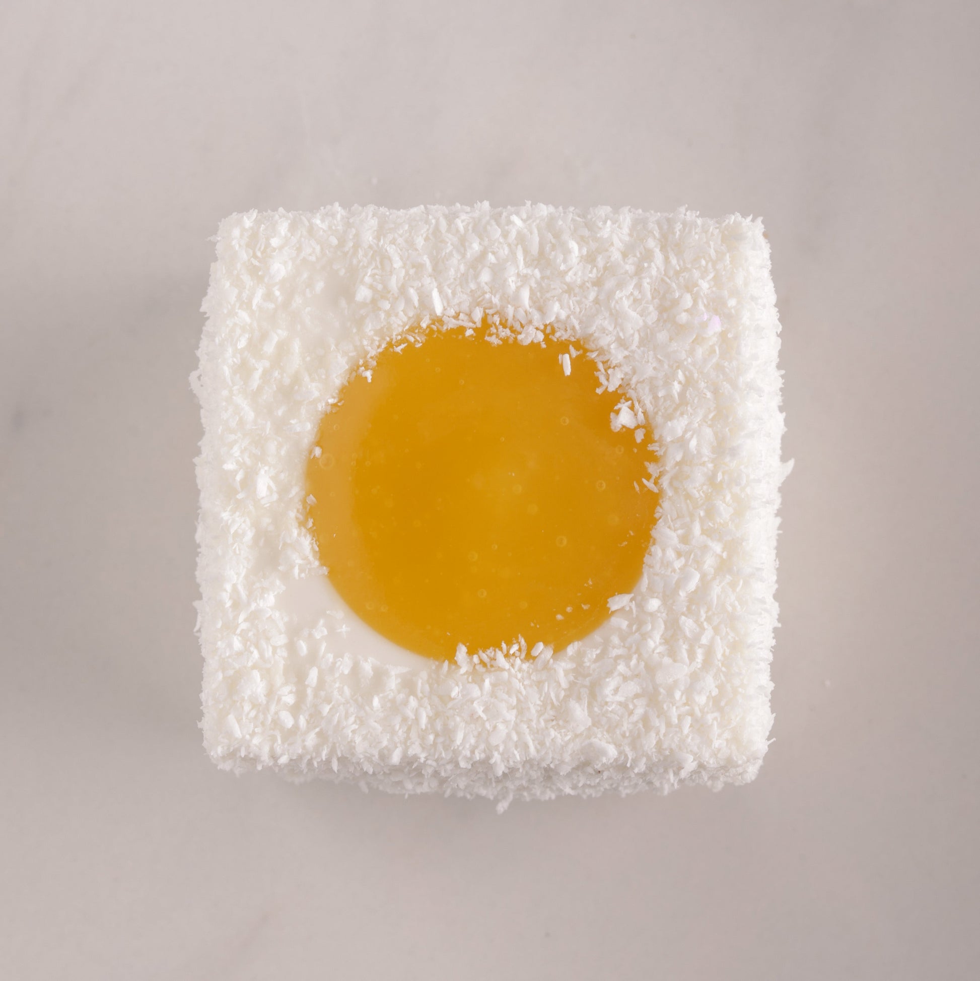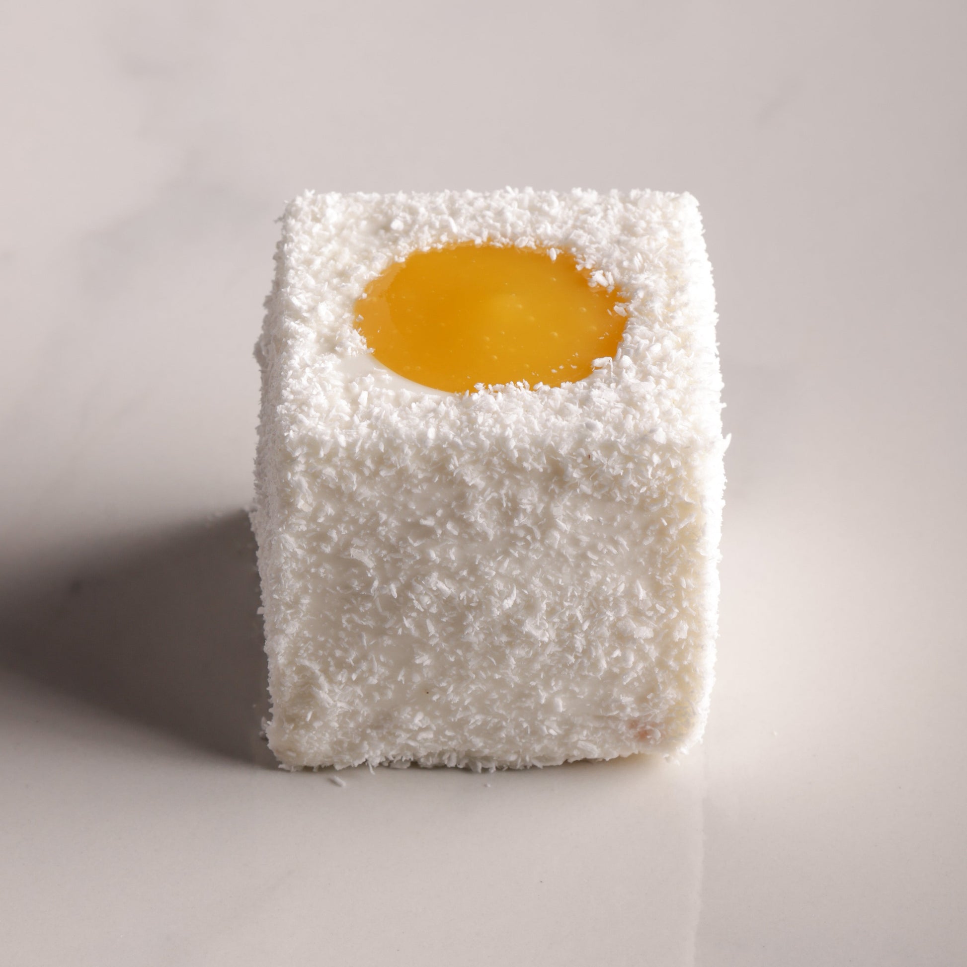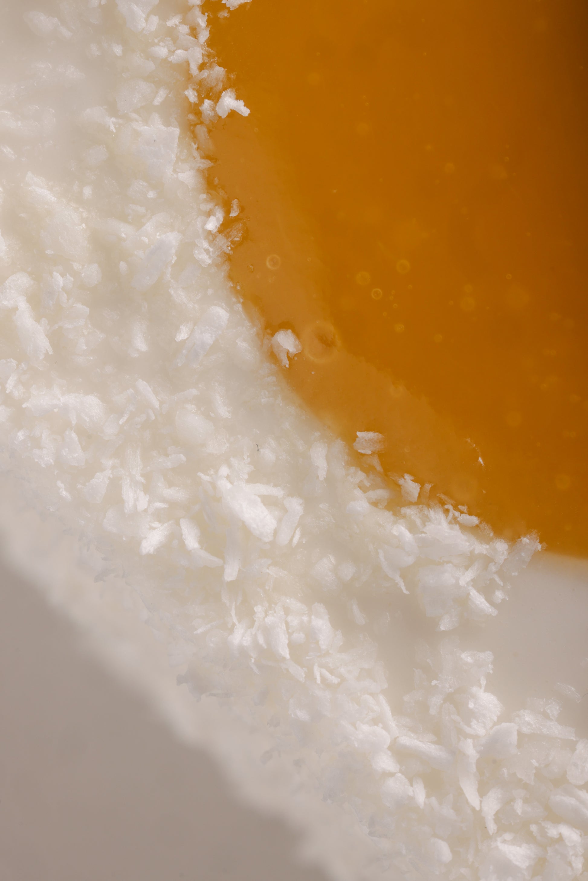 Blat pufos cu cocos, mousse de cocos*, cremeux de fructul pasiunii* și sos de mango.