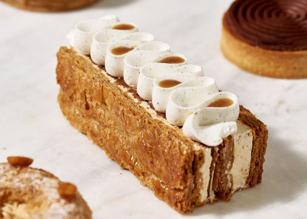 Aluat foietaj inversat, cremă mousseline și crocant cu alune de pădure, acoperit cu Chantilly și caramel.