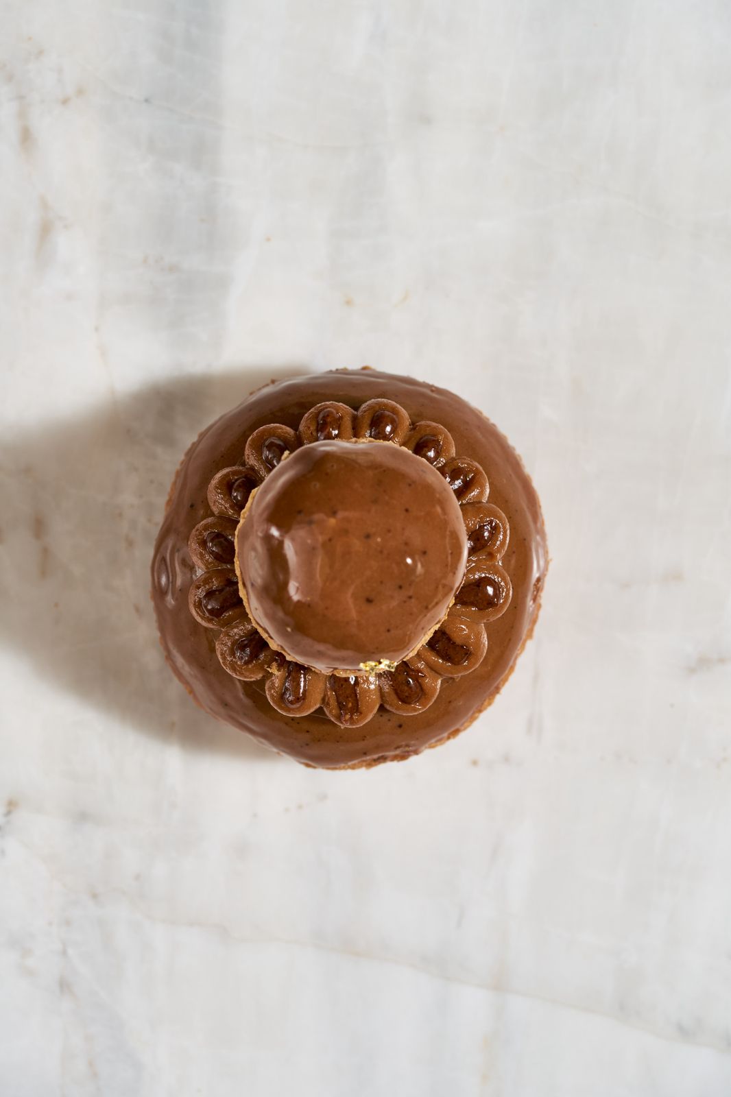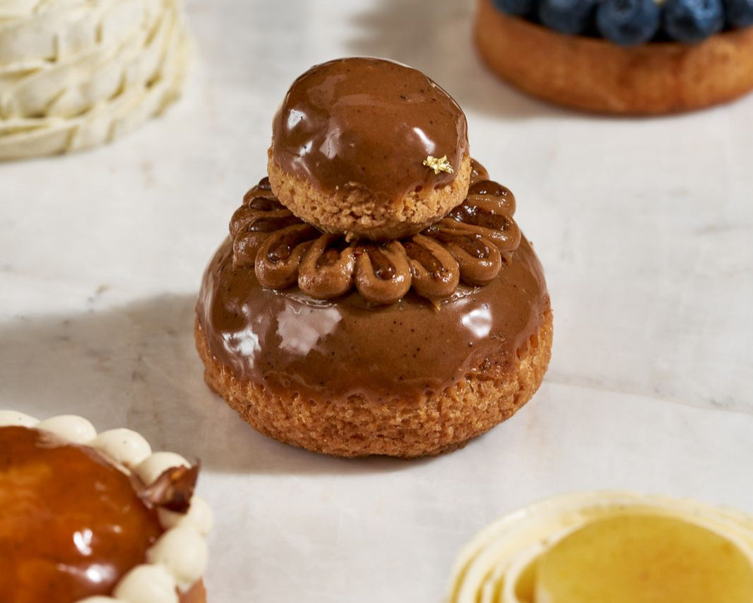 Choux-uri suprapuse acoperite cu craqueline, umplute cu cremă de cafea și pralină de cafea. Glazură de cafea și ciocolată albă.