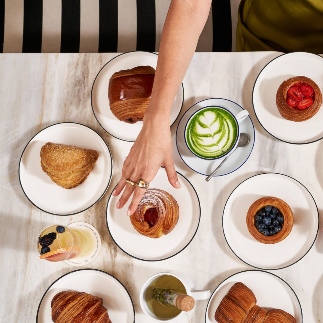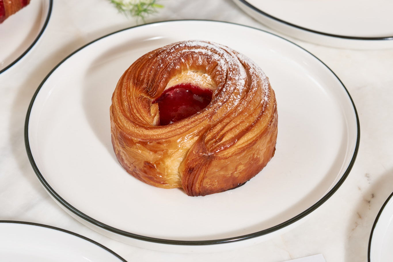 Aluat foietaj fermentat, cu unt, umplut cu cremă de rubarbă și confit de fructe roșii.