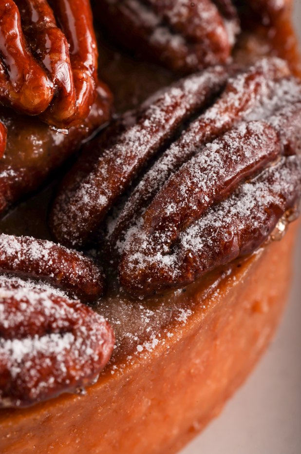 Aluat fraged umplut cu cremă frangipane cu nuci pecan și cremă de nuci pecan, decorat cu nuci pecan caramelizate.