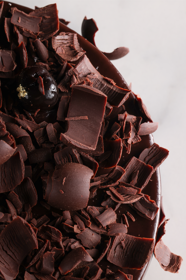 Blat de ciocolată însiropat cu lichior Kirsch, stratificat cu mousse de ciocolată neagră și cireșe Amarena.